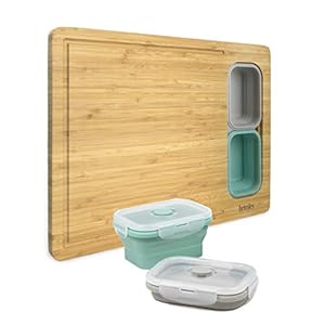 Brimley Bamboo Wood Cutting Board – Wooden Cutting Board with Containers and Lids for Food Storage – Over Edge Hanging Cutting Boards for Kitchen with Anti-slip Feet – Home and Kitchen Gadgets